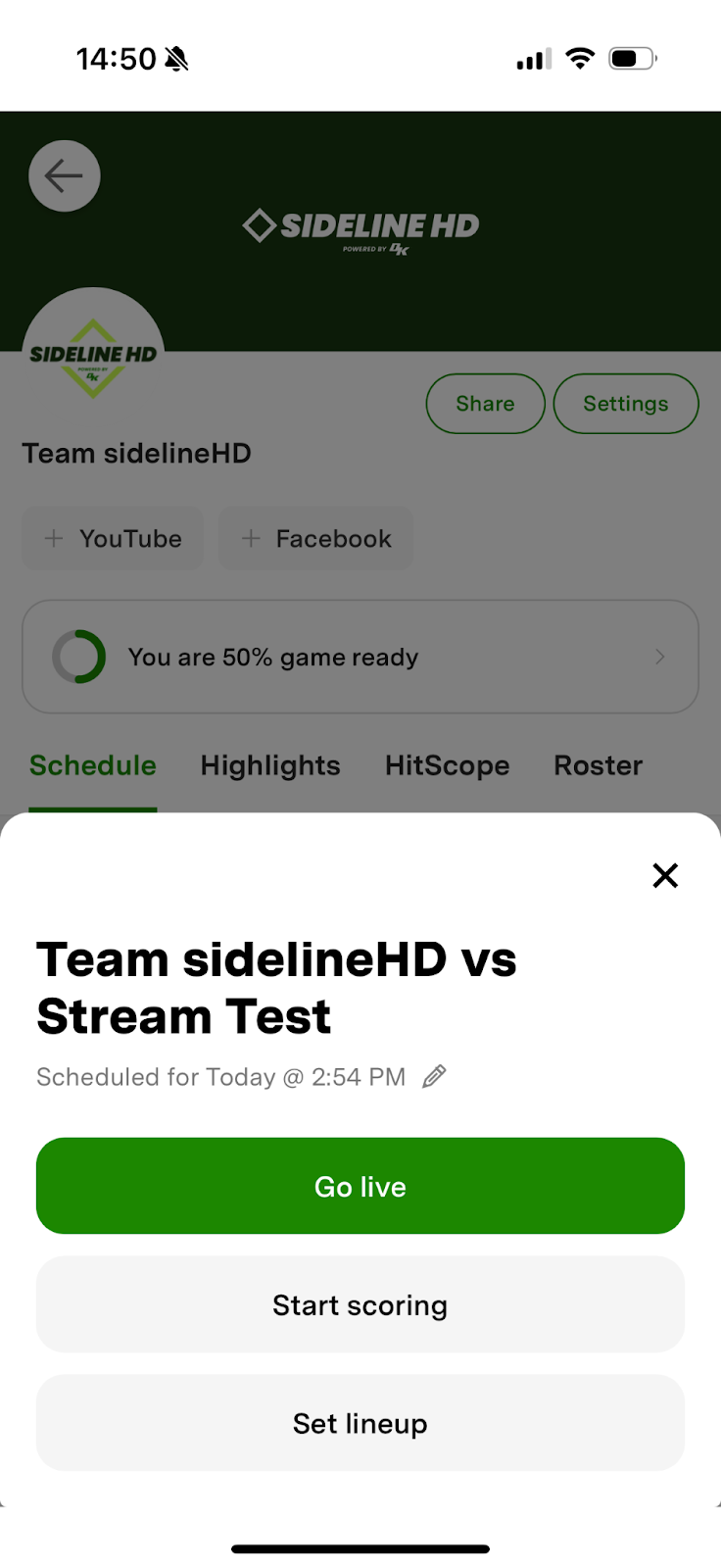 Note: If you have linked your account to a streaming destination like Facebook or YouTube, your test stream will go live on that platform, but your sidelineLIVE followers will not be informed you are live unless you share your link.
